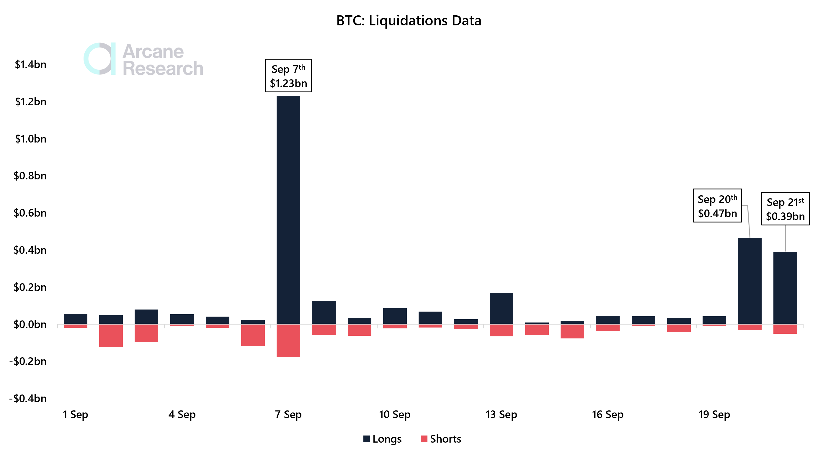 In the last two days, $860 million worth of longs have been liquidated as bitcoin has fallen from $47,000 to $40,000.This is substantially lower than the liquidation volumes during the September 7th crash of $1.2 billion and far lower than the levels seen during sell-offs this spring.This indicates that the current sell-off is a more organic spot-driven sell-off than previous crashes. This is also evident by less severe intraday swings. However, liquidations saw a sharp uptick as bitcoin plummeted from $43,000 to $40,000 this night.